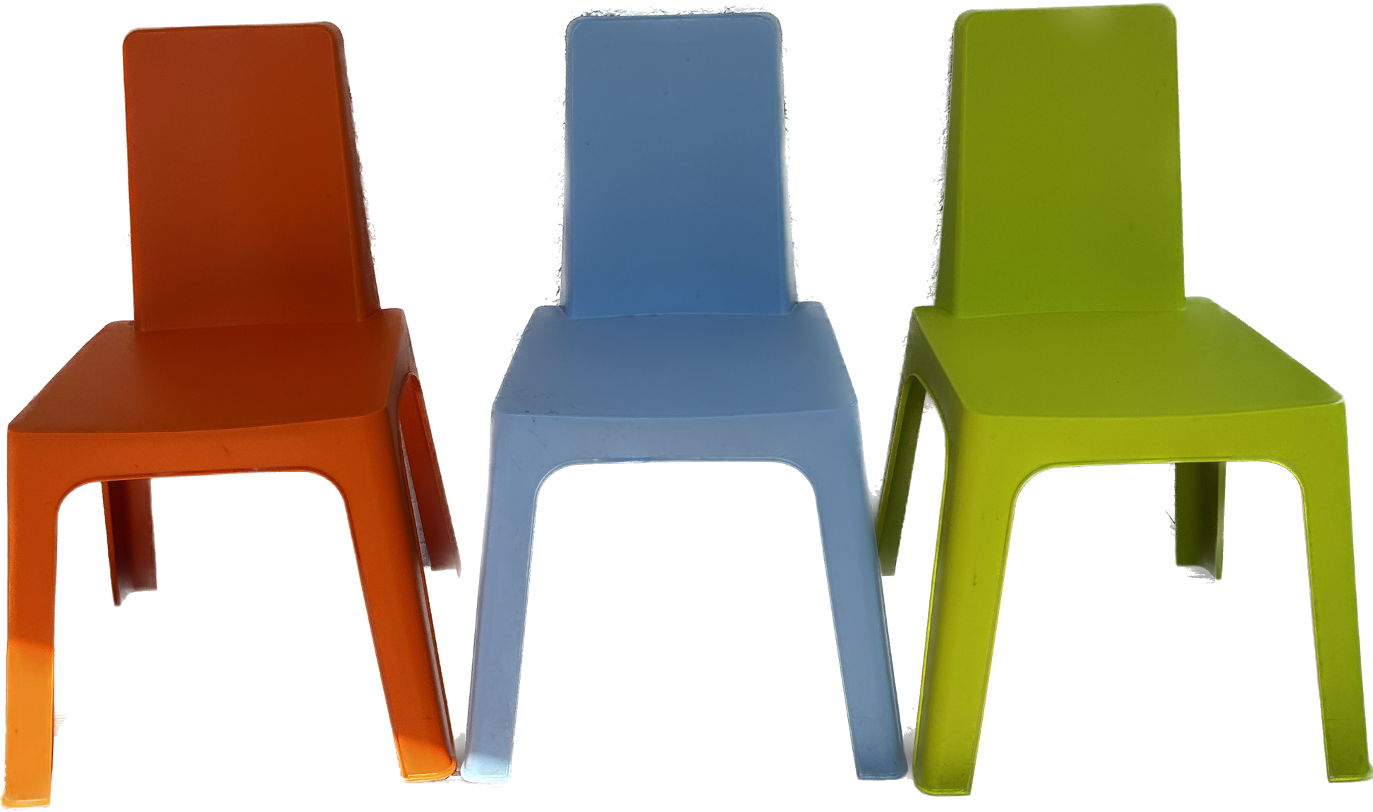 Ensemble de 3 chaises enfants orange bleu et verte vintage fabriquée en Espagne. Légère facile a empiler en très bon état.