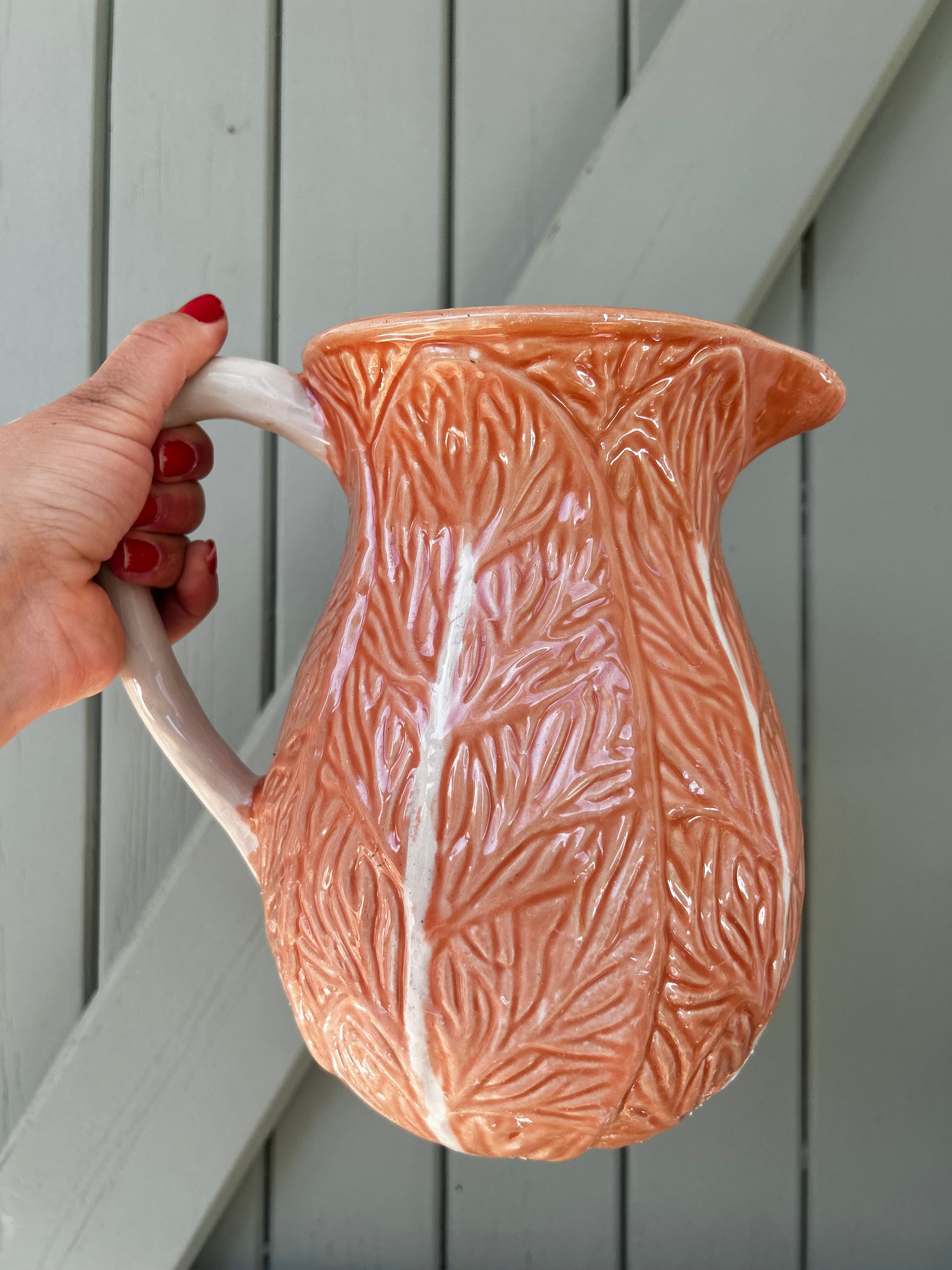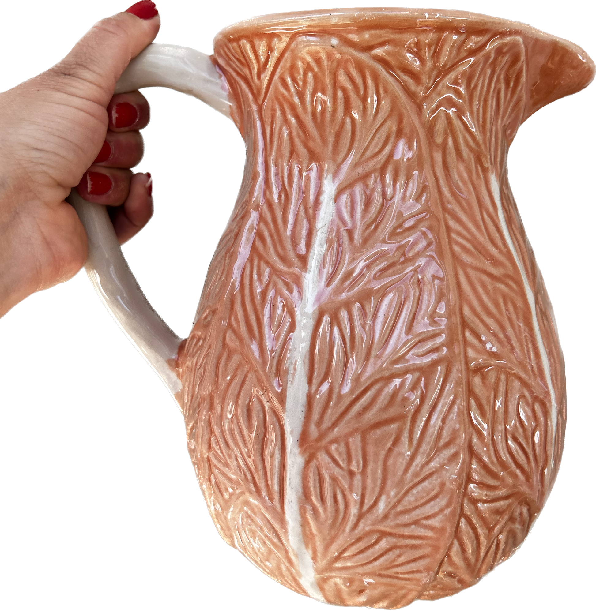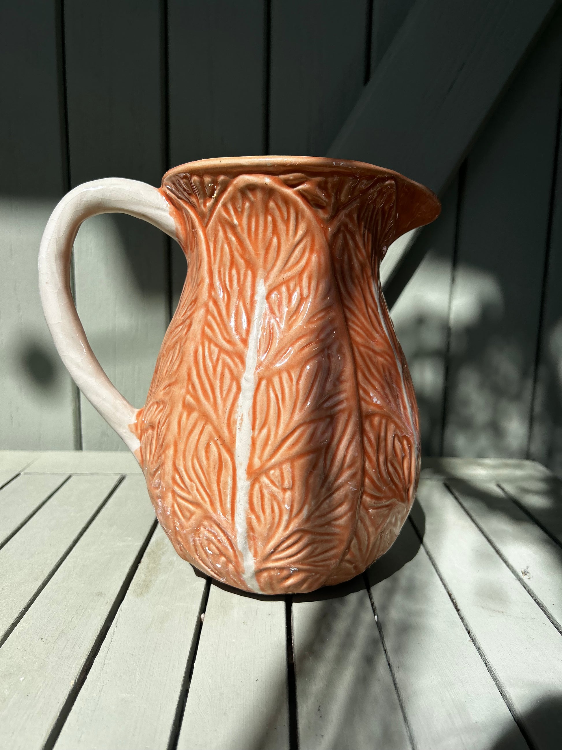 Ajoutez une touche de charme rétro à votre intérieur avec ce pichet en forme de chou abricot en barbotine. Cette pièce vintage en céramique allie l'originalité d'un design fruité à la fonctionnalité d'un pichet. Parfait comme élément décoratif ou pour servir vos boissons avec style.